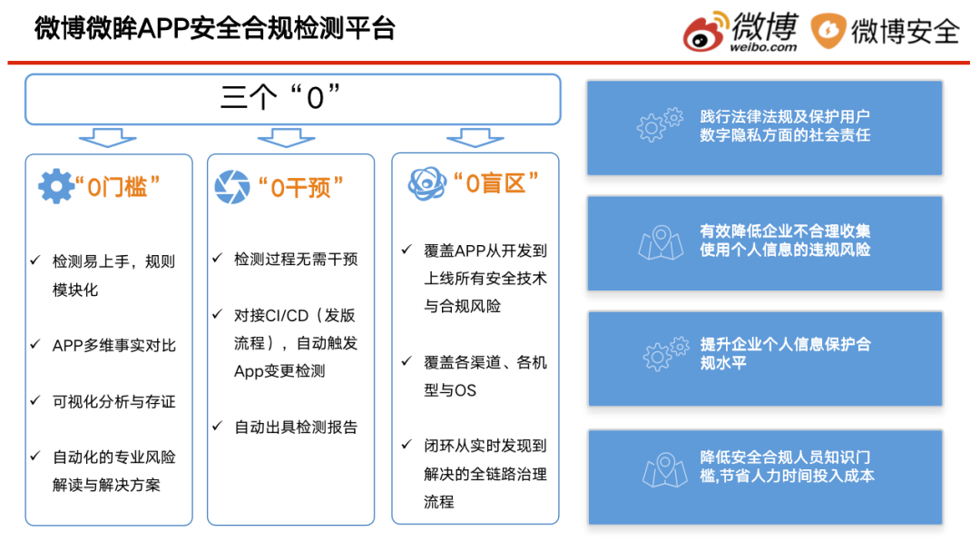 微博微眸APP安全合规检测平台实现了“0门槛、0干预、0盲区”的一站式APP合规性与安全性检测,大幅降低了安全人员所需的知识门槛,平台全程无需人工干预,已覆盖全机型、全周期的个人信息合规风险和安全漏洞检测,并实现风险处置闭环治理。同时,通过技术与流程相结合,做到“检测场景化”、“操作自动化”、“风险管理闭环化”。微眸平台帮助微博大幅提升了隐私合规工作的自动化水平和效率,更好地践行了用户数据隐私保护方面的社会责任。