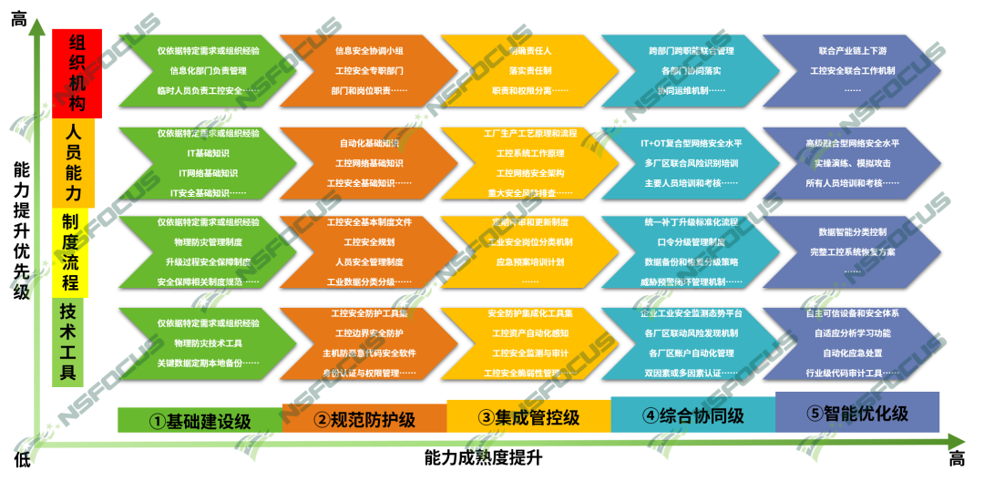 绿盟科技围绕工控安全防护能力成熟度模型的五个等级,即基础建设、规范防护、集成管控、综合协同、智能优化,提出了组织机构、制度流程、技术工具和人员能力四个安全要素的能力建设,通过以下模型结构图,助力工业企业整体工控安全防护能力渐进提升。