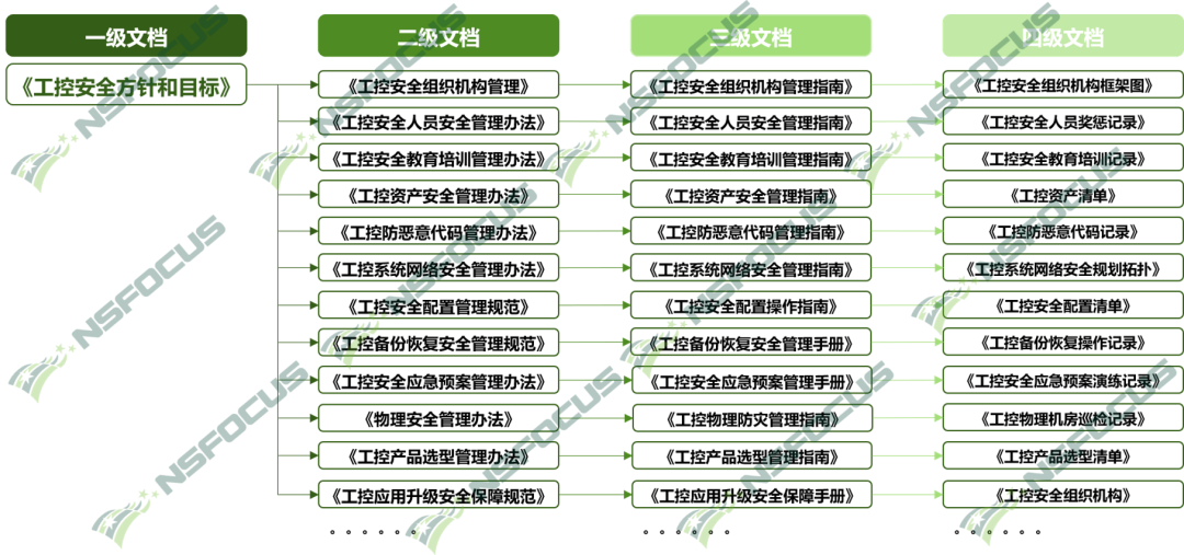 绿盟科技协助企业建立健全工控安全相关的管理制度和流程规则。工控安全管理制度流程建设参考ISO 27001四级文件体系,覆盖企业所有工控安全相关活动,保证企业范围内安全技术和安全运维的一致性,并加强针对制度本身创建、发布、评审修订的管理工作。