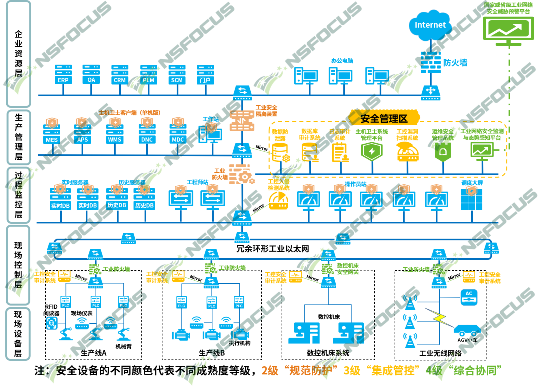 在各个生产线内部的核心控制设备(如PLC、CNC数控机床等)前端部署工业防火墙或数控机床安全网关,对工业通讯协议进行深度解析,对途经防火墙的工业协议字段与数据值进行检查,实现对核心控制设备的精准防护。