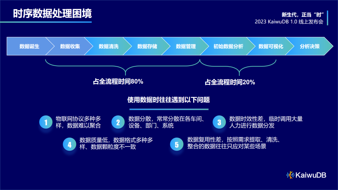 KDP 产品建设目标是实现数据的云边端的一体化治理,提供一套完整的全生命周期服务。接下来我将围绕时代背景、时序数据新解法及功能展示 3 大维度展开详细介绍。当前,我国数字经济发展已进入到快车道,数字经济产业不断壮大,为各大行业企业创造了转型和发展的机遇。物联网概念起源于 1999 年,5G 的正式商用进一步推动了物联网的高速发展,在物联网背景下,数据信息的价值将被进一步放大。据公开数据分析,我国物联网市场规模会由 1.7 万亿增长到 2.6 万亿,5 年复合增长率达 9%。同时,中国企业级市场规模在未来几年也将继续保持着全球最大的物联网市场体量。物联网产生源源不断的时序数据,在这里将出现第 1 个挑战:如何收集、处理、储存海量的时序数据?我们先一起来看看时序数据的处理过程,从数据诞生到分析决策共经历 6 大环节:数据收集、数据清洗、数据存储、数据管理 4 个环节约占全流程的 80%;初始数据分析和数据可视化仅占全流程约 20%。- 数据的复用性差,按照需求处理的数据仅能应对某些场景。