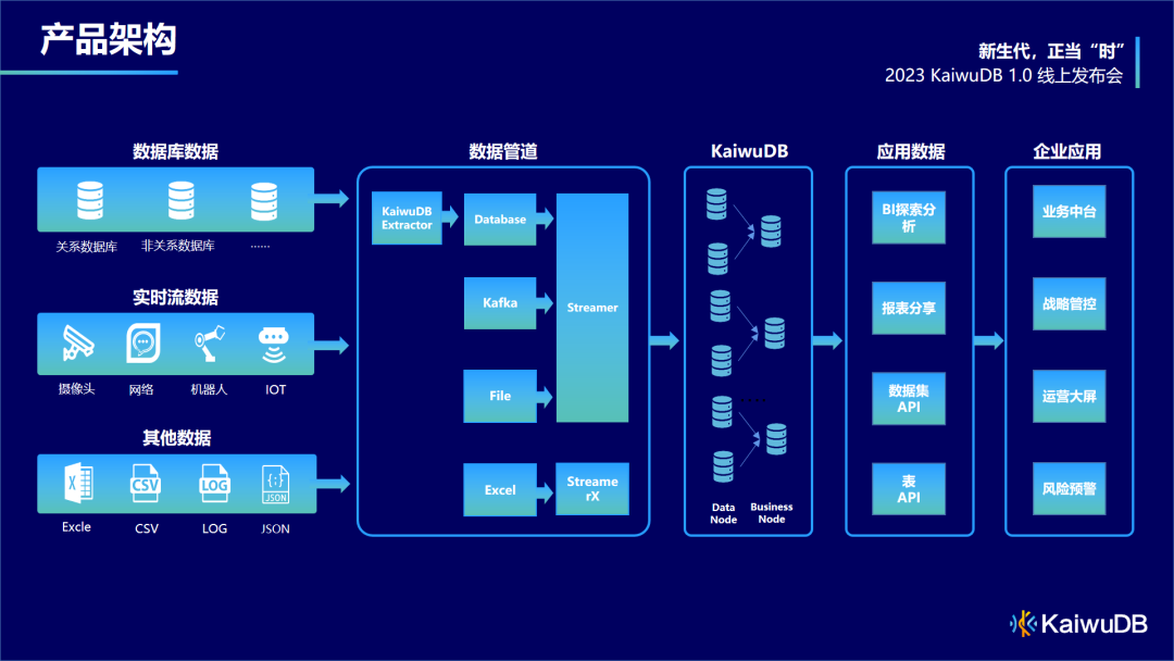 - 底座:支撑数据和主流数据源的实时/离线汇入,联合 KaiwuDB 提供一站式的实时数据解决方案。