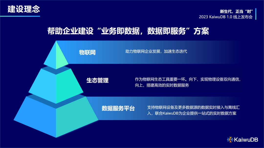 说到这里,前面提到的挑战难度也不可避免地增大—如何及时且快速地收集、处理、存储海量数据!业内伙伴会选择通过大数据强大的计算能力和 BI 可视化能力实现数据即时分析,企业通常会将开源的 Kafka、Redis、Hbase、Hadoop、Spark 等大数据软件组合使用,利用集群能力处理海量数据。但是,也将不可避免地带来很多问题:首先,多系统开发语言和工具不一致导致联调时间长,进而严重影响整体开发效率;其次,多系统运维后台相互独立,加重运维团队负担;此外,数据在多套系统中的传输,由于处理方案的限制,运行效率较低。这些问题都将拖慢整体应用推向市场的节奏。为此,我们推出了 “KaiwuDB+KDP”的解决方案,致力于解决数据流程中的收集、清洗、存储、管理、初始数据分析及数据可视化全流程的痛点。我们的建设理念是帮助企业快速成建设“业务即数据,数据即服务”的方案。- 中层:实现物理设备双向通信,既能集成数据,又能下发指令,向上提供高效实时数据服务,真正打通数据源端到企业管理端的数据流;