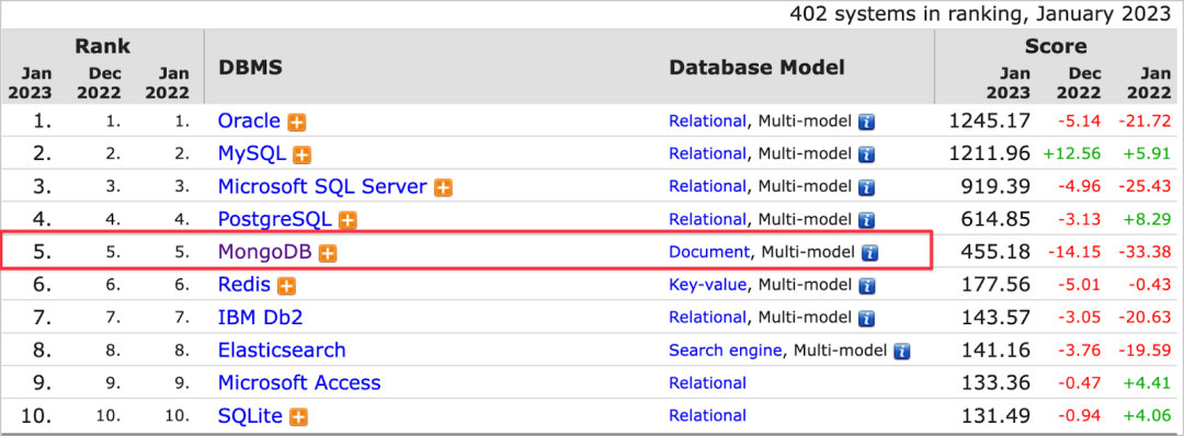 排名显示,MongoDB 是前 5 名中唯一的 NoSQL 数据库。