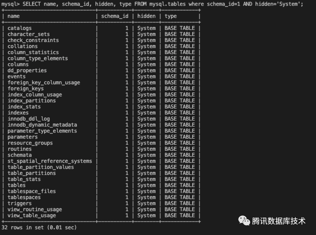 8.0 中新的数据字典 Data Dictionary 是基于 InnoDB 存储引擎的事务表实现的,我们可以通过InnoDB提供的接口看到都有哪些元数据表。