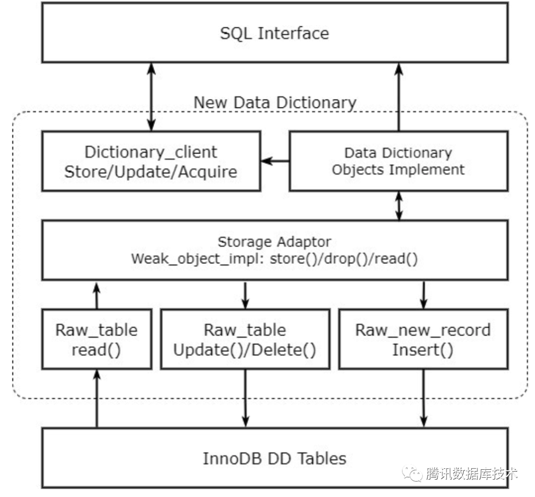 Client层:主要负责对外提供统一访问接口以及缓存管理,SQL层的Table Define Cache就是通过DD Client 接口去获取那些之前需要从FRM文件中读的内容。同样,InnoDB层的Dict Cache也是通过DD Client读取的。
