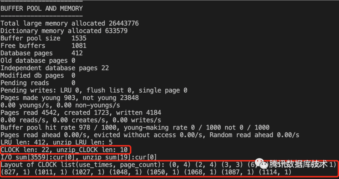 使用CLOCK list的方法很简单,只需要在INSERT、DELETE、UPDATE等DML关键词后添加名为independent的hint即可,例如select *+ independent */ id from t。CLOCK list的长度、页面被使用次数分布等信息可以使用show engine innodb status命令观察。如下图所示:
