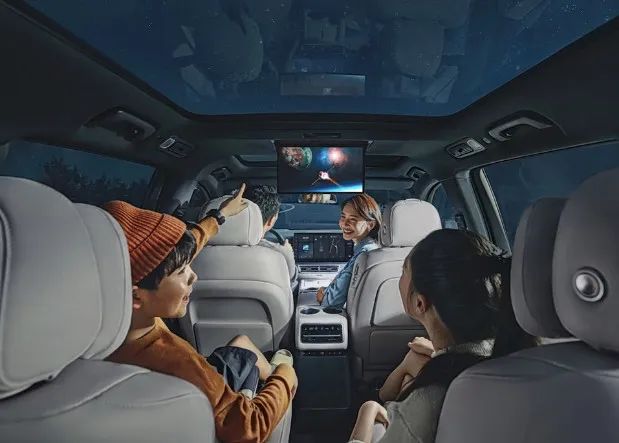 小编依然记得,秋季某日开车回家路上,见得前方一辆新款理想。还未识别出是什么车型,但通过后车窗,能清晰看到从中顶悬挂下来一块硕大的屏幕,上面正播放着《小猪佩奇》的片段。