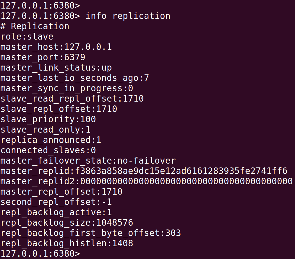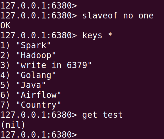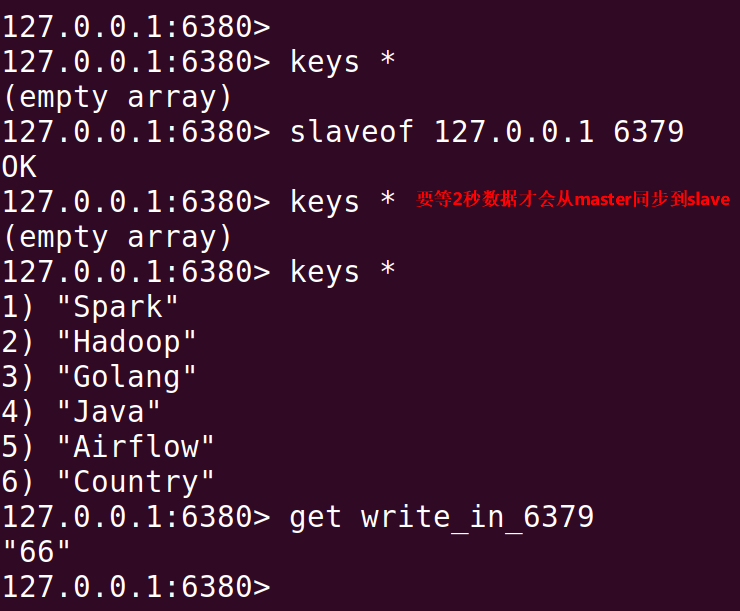 从上面的例子中可以看出,在6380成为6379的slave之后,6379会将自己的所有数据全都同步给6380。之后每当6379中有新的key加入时,6379会将新的key也同步到6380(如例子中的write_in_6379)。针对master 6379的任何修改都可以同步到slave 6380。