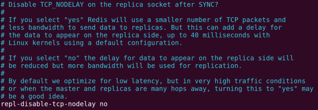 开启TCP_NODELAY时,master节点产生的数据无论多少都会及时发送给slave节点,这样master、slave之间的延迟就会变小,但会增加网络带宽资源的消耗。适用于主从之间的网络环境良好的场景,例如master、slave节点部署在同机架或同机房。