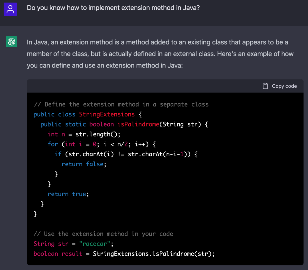好吧,ChatGPT 认为 Java 里面的扩展方法就是通过工具类提供的静态方法 :)。所以接下来我将介绍一种全新的黑科技: