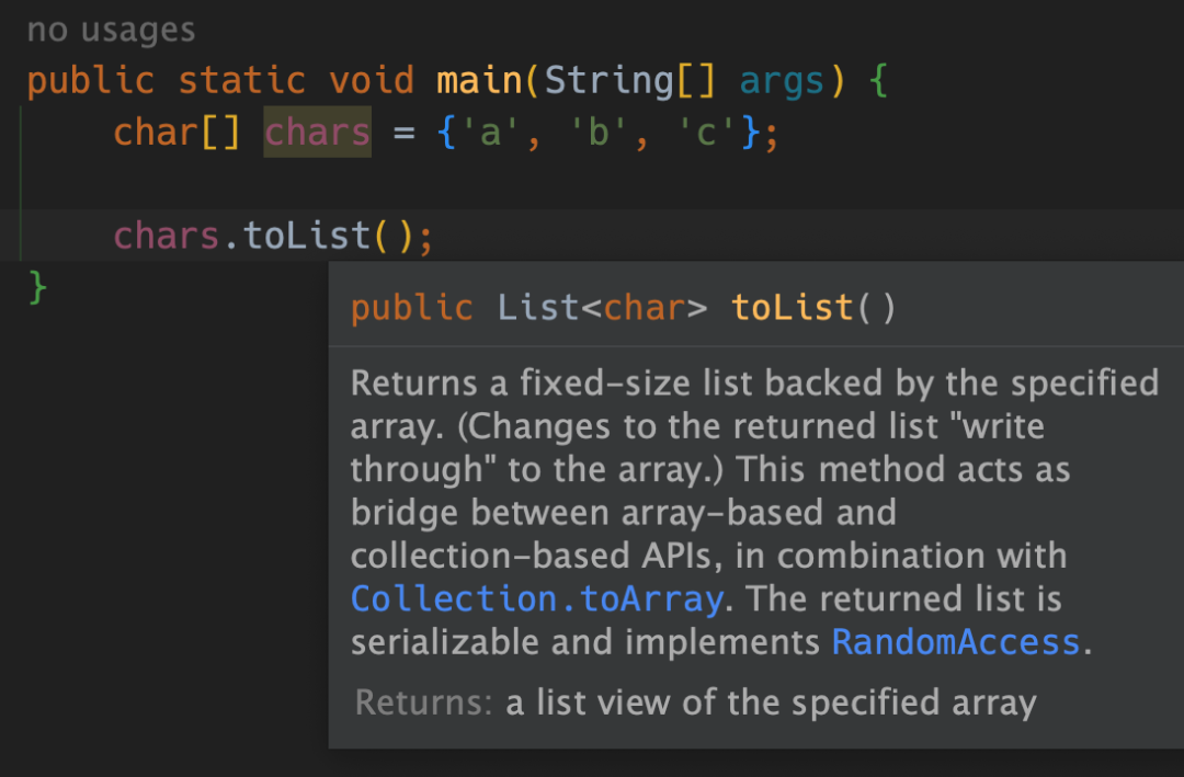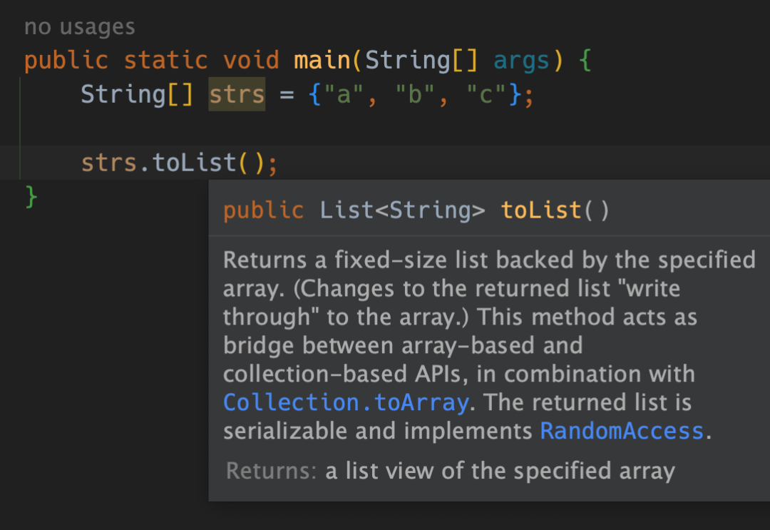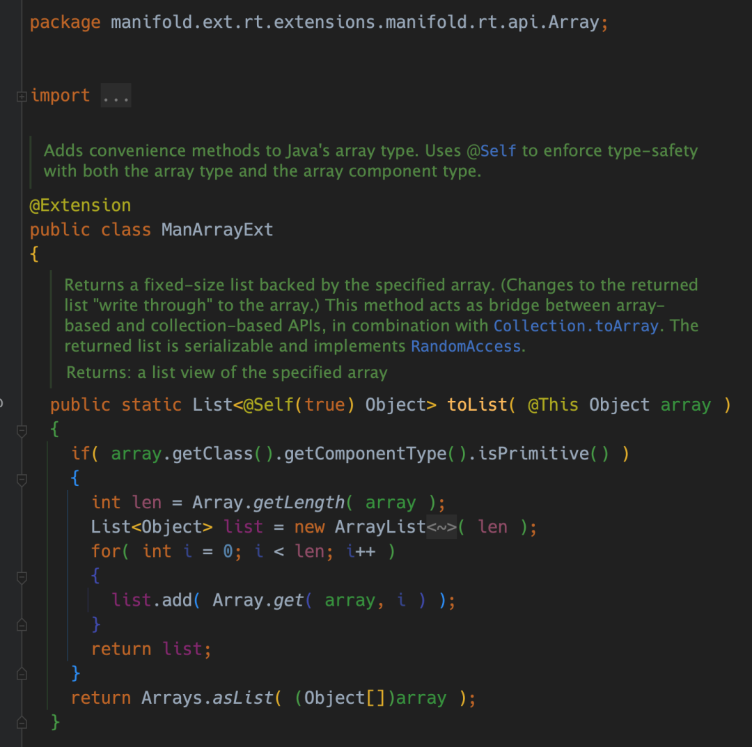 package com.alibaba.aladdin.app.extensions.java.util.List;import manifold.ext.rt.api.Extension;import manifold.ext.rt.api.This;import java.util.Arrays;import java.util.Collections;import java.util.List;/*** List 扩展方法*/@Extensionpublic final class ListExt {/*** 返回只包含一个元素的不可变 List*/@Extensionpublic static <E> List<E> of(E element) {return Collections.singletonList(element);}/*** 返回包含多个元素的不可变 List*/@Extension@SafeVarargspublic static <E> List<E> of(E... elements) {return Collections.unmodifiableList(Arrays.asList(elements));}}
