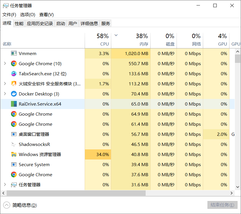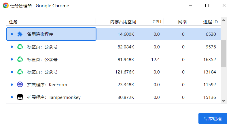 Windows 系统比较麻烦,可能CPU占用并不高,内存也用只用了不到50%,但还是感觉操作卡顿。这里提供一下处理思路,首先调用系统的任务管理器检查当前系统状态,Windows 的任务管理器快捷键为 Ctrl+Shift+Esc,如果怀疑 Chrome 出现异常,Chrome 的任务管理器为 Shift+Esc