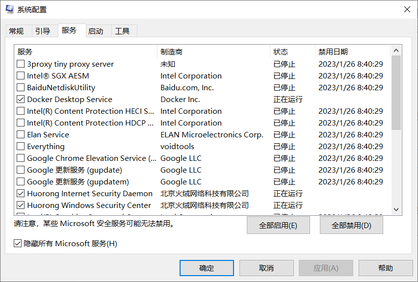 还有一些进程是服务,这次处理了下次重启它可以还会造成卡慢。此时就要对开机项进行筛查了。在命令行或运行窗口执行 msconfig,对非 Windows 服务进行关停: