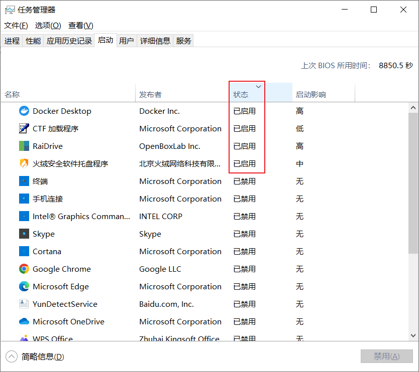 Win10 之后的启动项转到任务管理器中了,对状态进行排序,检查已启用的开机项,禁用掉不用的开机项。
