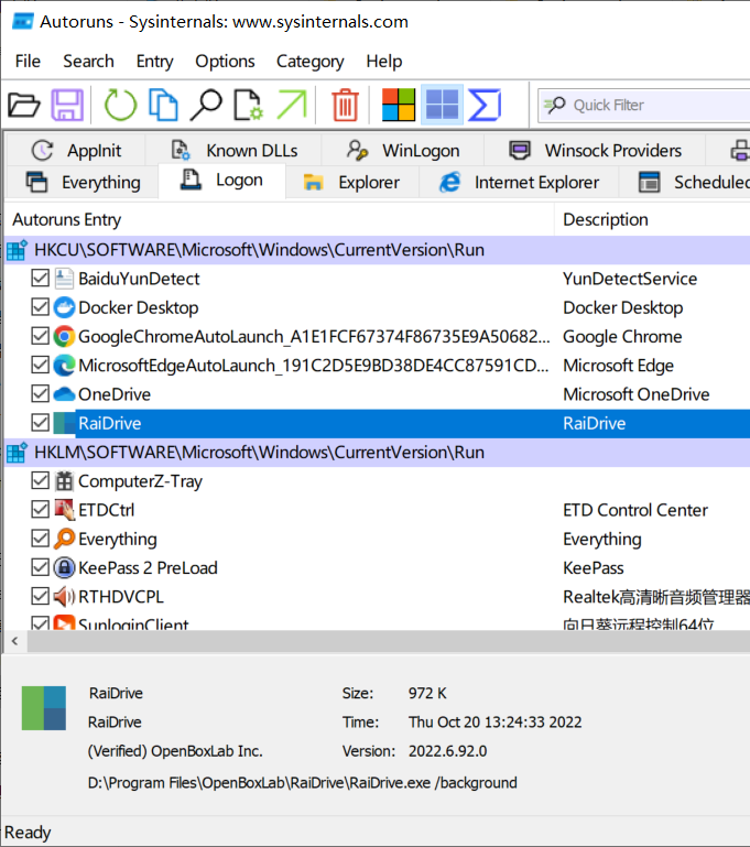 管理开机启用还有一个微软自家的小工具 sysinternals 工具包下的 autorun 工具,可以在微软官网下载。