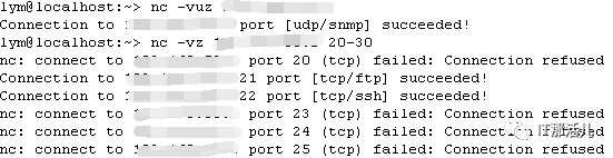 -v 调试模式,输出交互或出错信息。 -u 指定nc使用UDP协议,默认为TCP。 -z zero,表示扫描时不发送任何数据。