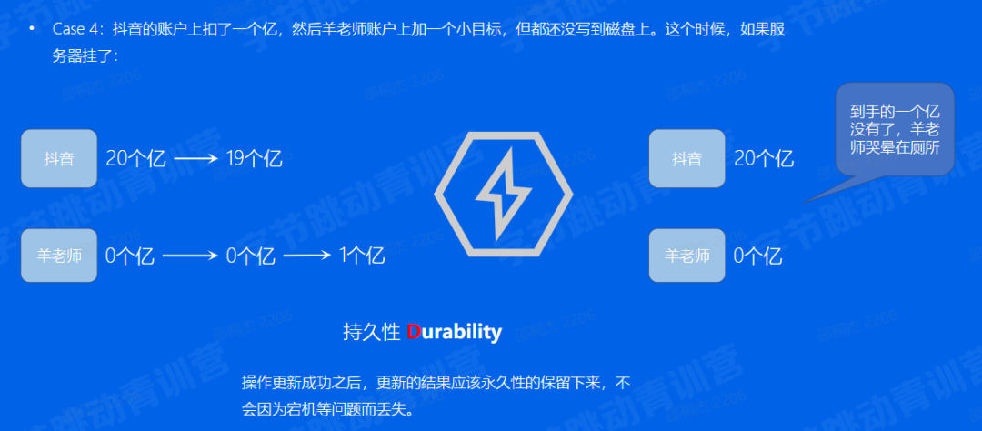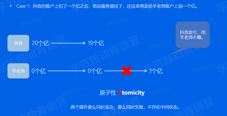 万一抖音给我的账户转账的事务还没完成,羊老师就查到了账户上有一个亿,后来抖音发现不对,把这个事务回滚掉了。过一会羊老师发现自己账户的一个亿又没了,去找银行要个说法,结果被保安赶了出来。