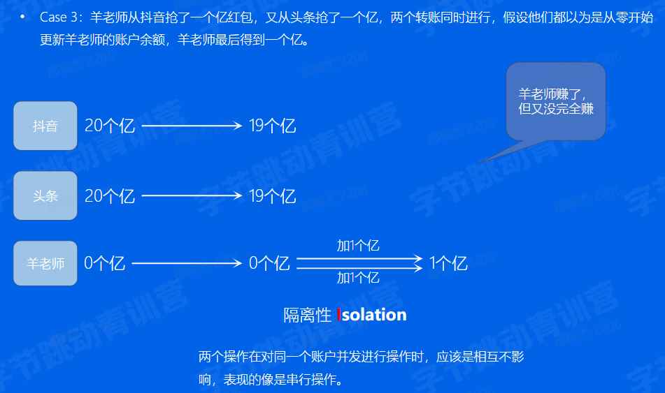 前情提要:羊老师从抖音抢了一个亿红包,又从头条抢了一个亿。抖音和头条都要往羊老师的账户转一个亿, 如果两个操作同时进行,发生冲突怎么办?