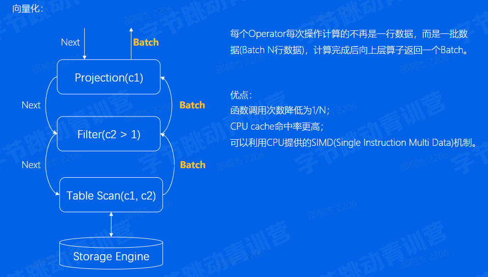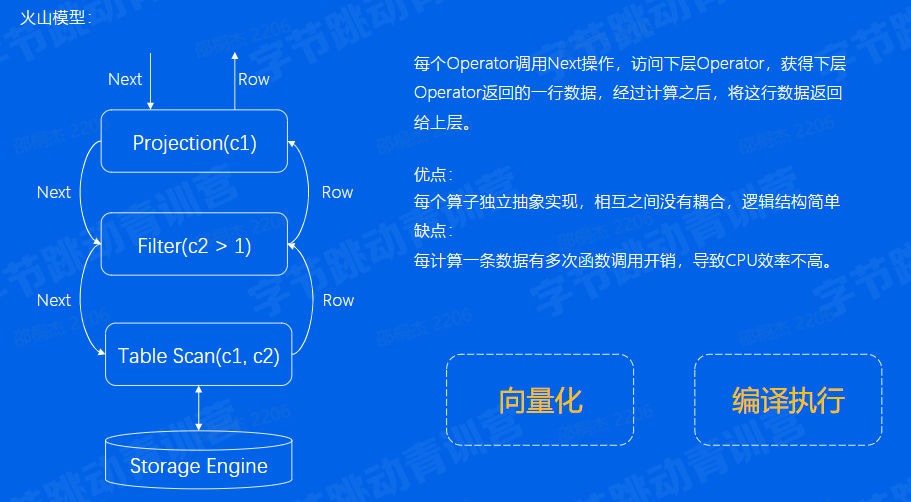 向量化执行更适合于大批量数据处理,对于很多单行数据处理并没有优势。而且往往搭配列式存储使用。