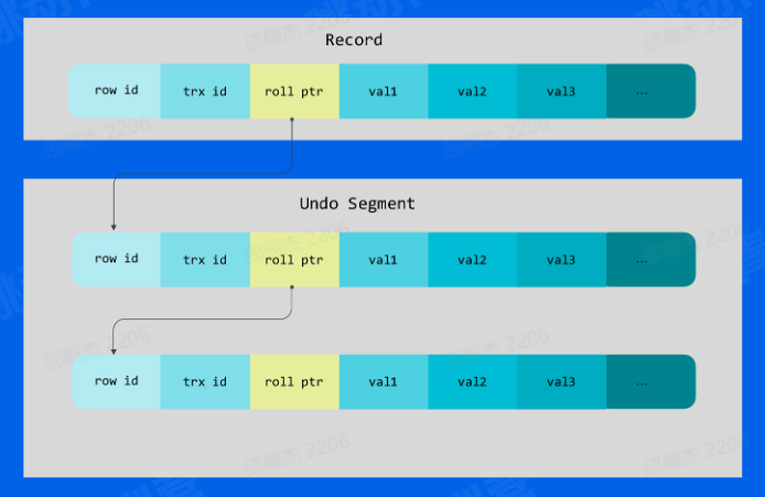 每个事务有一个单增的事务ID; 数据页的行记录中包含了 DB_ROW_ ID