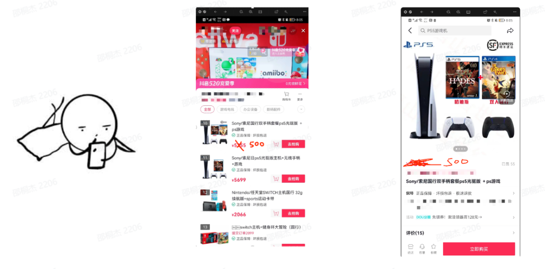 看下面的这个的场景,有一天晚上晚上我们上完课,回到宿舍,想着新出的游戏机,但又摸了摸钱包,太贵了买不起,这个时候你突然想到,今天抖音直播搞活动,瞬间你掏出了手机打开抖音搜索,找到直播间以后,你点开了心心念念的游戏机详情页,看到价格只要500。