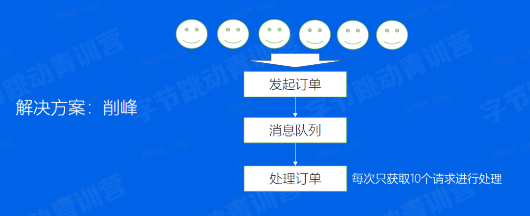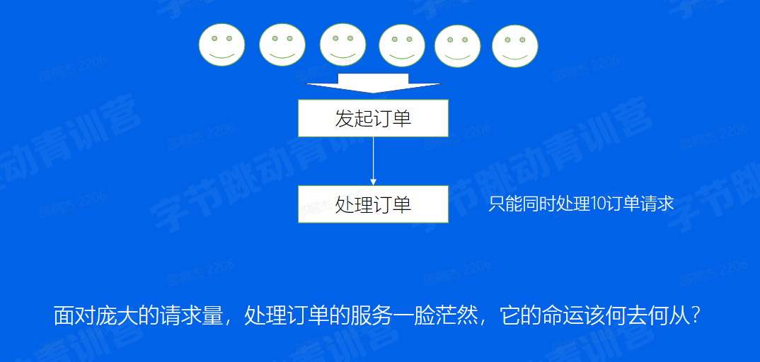 可以看到,一堆人都发起了订单请求,可是公司给的预算不够,服务器的配置太弱,订单服务只能同事处理10个订单请求。