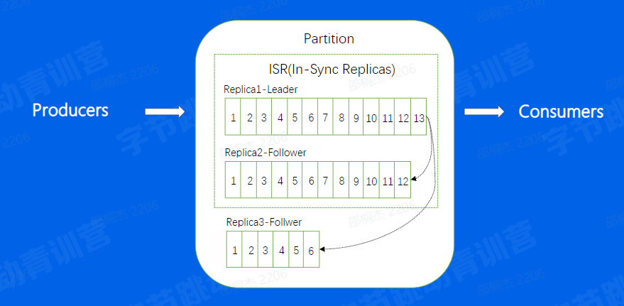 而此时,因为数据在不断的写入,对于刚刚关闭重启的Broker来说,和新Leader之间一定会存在数据的滞后,此时这个Broker会追赶数据,重新加入到ISR当中