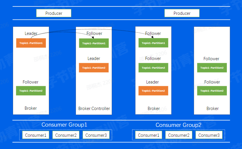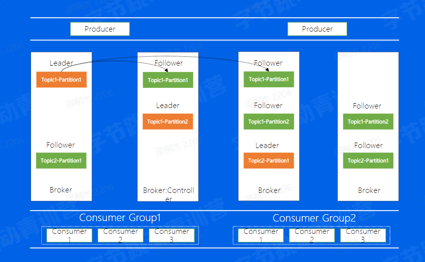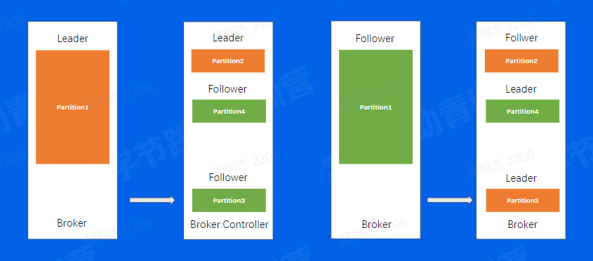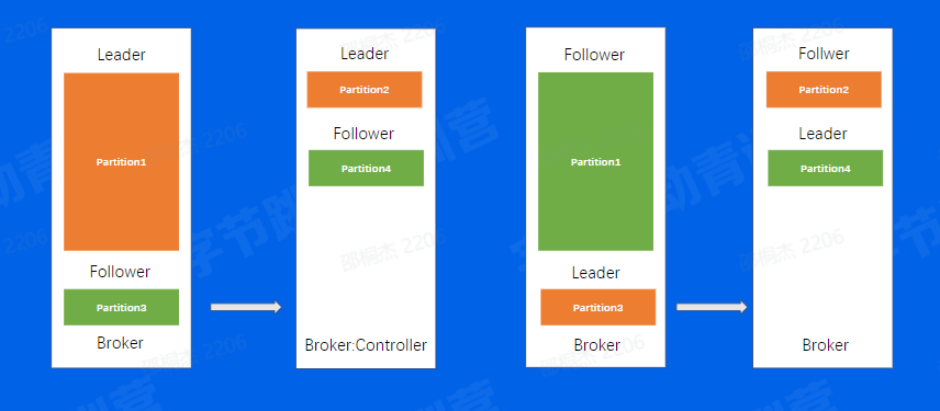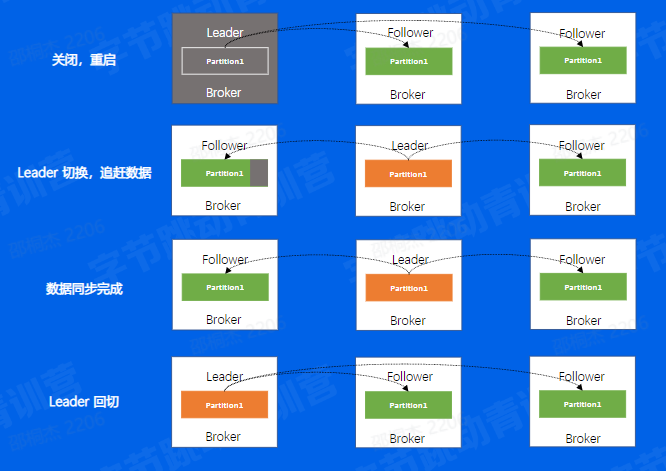 举个例子来说,如果我们对一个机器进行重启首先,我们会关闭一个Broker,此时如果该Broker上存在副本的Leader,那么该副本将发生leader切换,切换到其他节点上面并且在ISR中的Follower副本,可以看到图中是切换到了第二个Broker上面