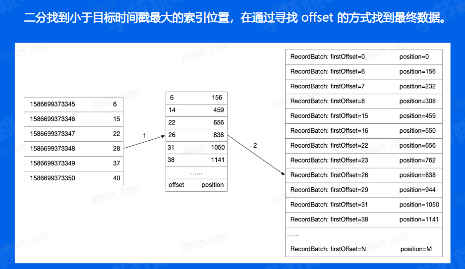 如果我们需要使用时间戳来寻找的时候,和offset相比只是多加了以及索引,也就是通过二分找到时间戳对应的offset,再重复之前的步骤找到相应的文件数据