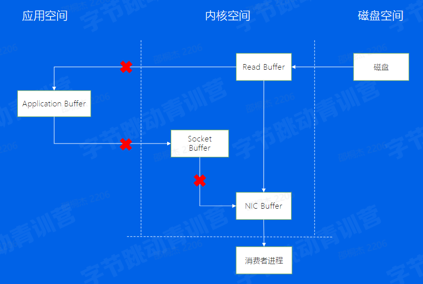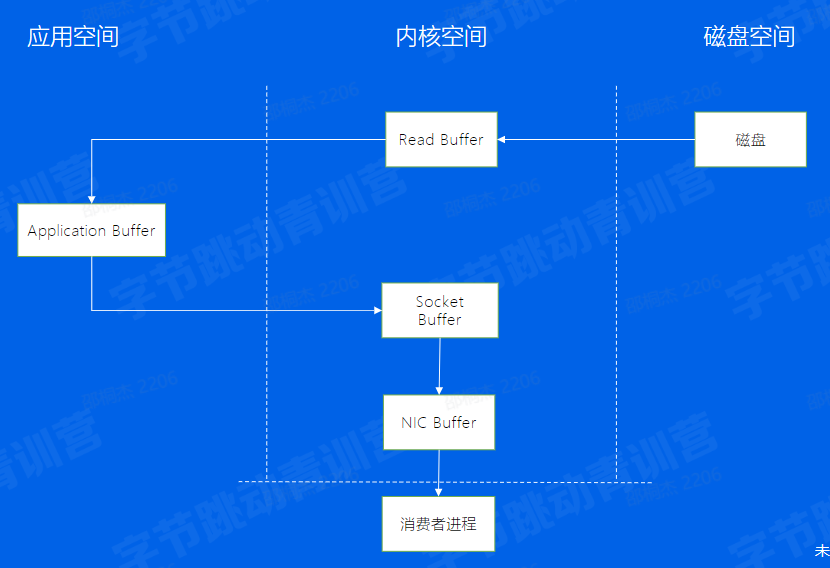 Consumer从Broker中读取数据,通过sendfile的方式,将磁盘读到os内核缓冲区后,直接转到socket buffer进行网络发送 Producer生产的数据持久化到broker,采用mmap文件映射,实现顺序的快速写入