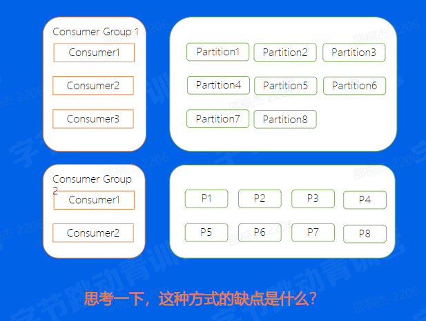 这些Consumer再启动的时候就已经知道分配方案了,但这样这种方式的缺点又是什么呢,想象一下,如果我们的Consumer3挂掉了,我们的7,8分片是不是就停止消费了。又或者,如果我们新增了一台Consumer4,那是不是又需要停掉整个集群,重新修改配置再上线,保证Consumer4也可以消费数据,其实上面两个问题,有时候对于线上业务来说是致命的。