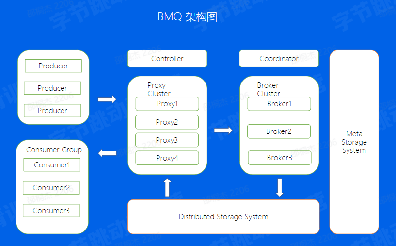 BMQ兼容Kafka协议,存算分离,云原生消息队列,初期定位是承接高吞吐的离线业务场景,逐步替换掉对应的Kafka集群,我们来了解一下BMQ的架构特点