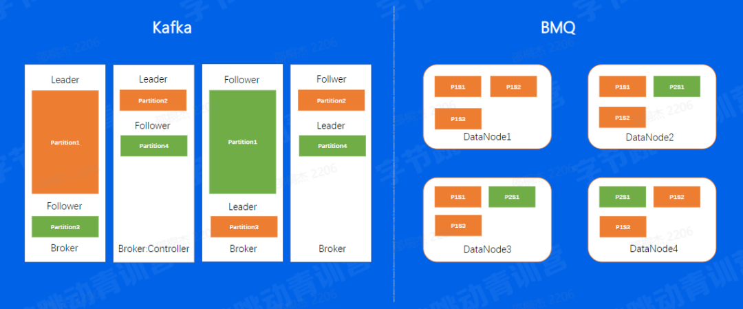 对于Kafka分片数据的写入,是通过先在Leader上面写好文件,然后同步到Follower上,所以对于同一个副本的所有Segment都在同一台机器上面。就会存在之前我们所说到的单分片过大导致负载不均衡的问题,但在BMQ集群中,因为对于单个副本来讲,是随机分配到不同的节点上面的,因此不会存在Kafka的负载不均问题。