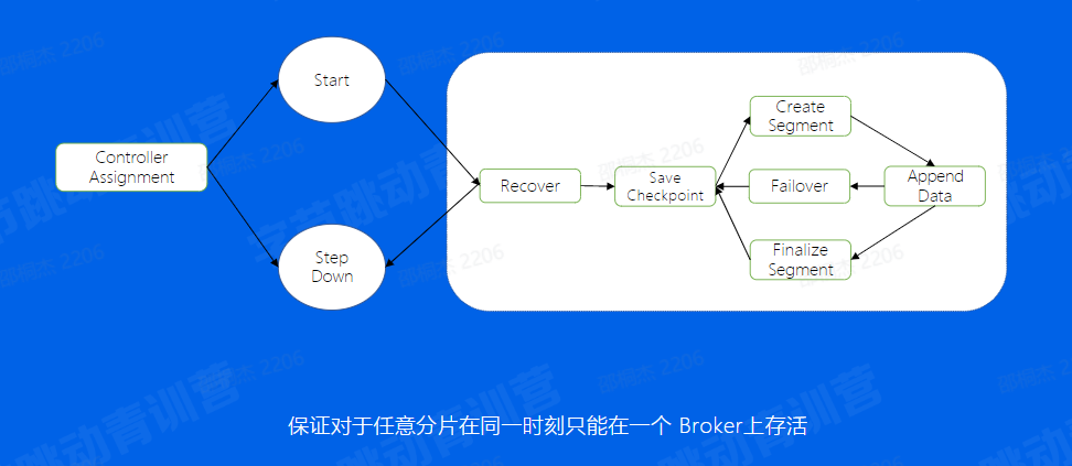 其实对于写入的逻辑来说,我们还有一个状态机的机制,用来保证不会出现同一个分片在两个Broker上同时启动的情况,另外也能够保证一个分片的正常运行。