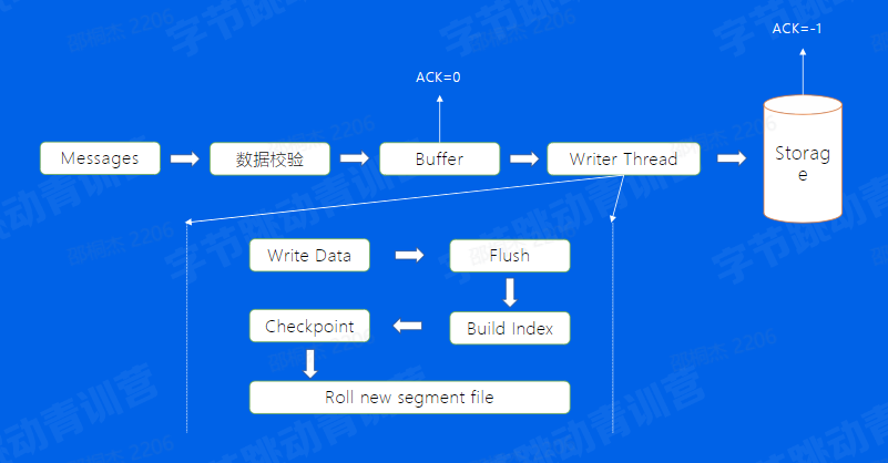 数据校验:CRC , 参数是否合法 校验完成后,会把数据放入Buffer中 通过一个异步的Write Thread线程将数据最终写入到底层的存储系统当中 这里有一个地方需要注意一下,就是对于业务的写入来说,可以配置返回方式,可以在写完缓存之后直接返回,另外我也可以数据真正写入存储系统后再返回,对于这两个来说前者损失了数据的可靠性,带来了吞吐性能的优势,因为只写入内存是比较快的,但如果在下一次flush前发生宕机了,这个时候数据就有可能丢失了,后者的话,因为数据已经写入了存储系统,这个时候也不需要担心数据丢失,相应的来说吞吐就会小一些 我们再来看看Thread的具体逻辑,首先会将Buffer中的数据取出来,调用底层写入逻辑,在一定的时间周期上去flush,flush完成后开始建立Index,也就是offset和timestamp对于消息具体位置的映射关系 Index建立好以后,会save一次checkpoint,也就表示,checkpoint后的数据是可以被消费的辣,我们想一下,如果没有checkpoint的情况下会发生什么问题,如果flush完成之后宕机,index还没有建立,这个数据是不应该被消费的 最后当文件到达一定大小之后,需要建立一个新的segment文件来写入