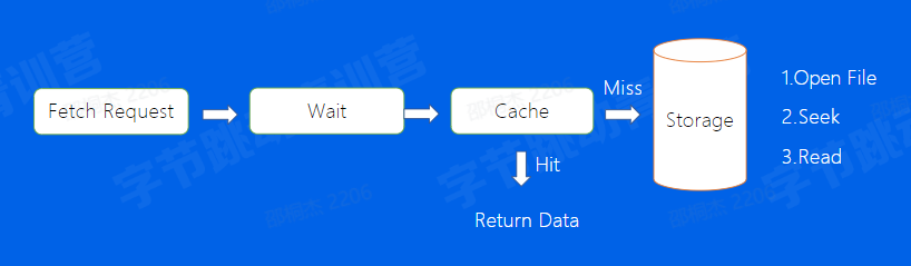 首先Consumer发送一个Fetch Request,然后会有一个Wait流程,那么他的左右是什么呢,想象一个Topic,如果一直没有数据写入,那么,此时consumer就会一直发送Fetch Request,如果Consumer数量过多,BMQ的server端是扛不住这个请求的,因此,我们设置了一个等待机制,如果没有fetch到指定大小的数据,那么proxy会等待一定的时间,再返回给用户侧,这样也就降低了fetch请求的IO次数,经过我们的wait流程后,我们会到我们的Cache里面去找到是否有存在我们想要的数据,如果有直接返回,如果没有,再开始去存储系统当中寻找,首先会Open这个文件,然后通过Index找到数据所在的具体位置,从这个位置开始读取数据