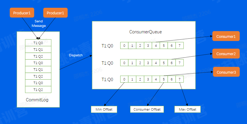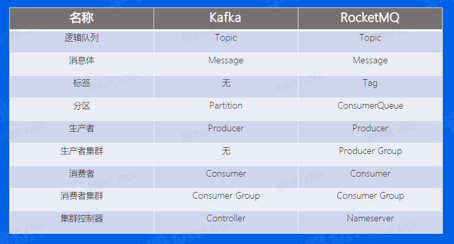 根据我们刚刚的介绍,可以看到Producer,Consumer,Broker这三个部分,Kafka和RocketMQ是一样的,而Kafka中的Partition概念在这里叫做ConsumerQueue