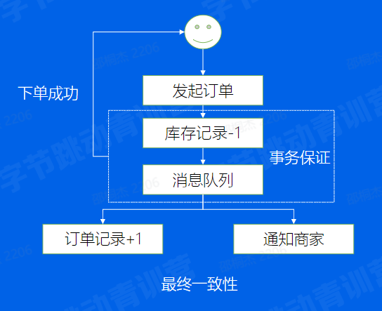 首先我保证库存足够能够顺利-1,这个时候再消息队列让我其他系统来处理,比如订单系统和商家系统,但这里有个比较重要的点,我库存服务和消息队列必须要是在同一个事务内的,大家还记不记得事务的基本特性是什么。ACID,这里库存记录和往消息队列里面发的消息这两个事情,是需要有事务保证的,这样不至于发生,库存已经-1了,但我的订单没有增加,或者商家也没有收到通知要发货。