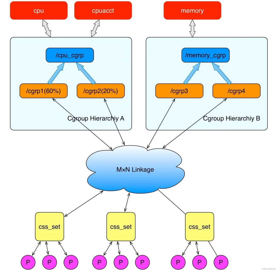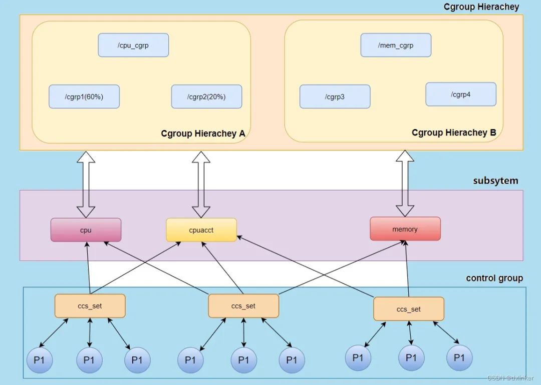 4)子系统(subsystem):一个子系统就是一个资源控制器,比如 cpu 子系统就是控制 cpu 时间分配的一个控制器。子系统必须附加(attach)到一个层级上才能起作用,一个子系统附加到某个 层级以后,这个层级上的所有控制族群都受到这个子系统的控制。