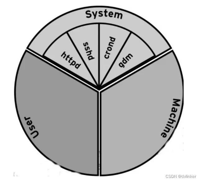 下面我们以 CPU 资源为例,来解释一下上图中出现的一些关键词。如上图所示,系统默认创建了 3 个顶级 slice(System, User 和 Machine),每个 slice 都会获得相同的 CPU 使用时间(仅在 CPU 繁忙时生效),如果 user.slice 想获得 100% 的 CPU 使用时间,而此时 CPU 比较空闲,那么 user.slice 就能够如愿以偿。这三种顶级 slice 的含义如下: