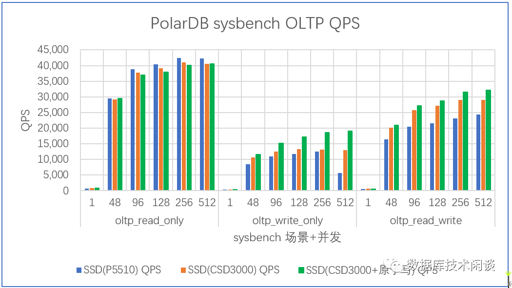 此时测试 sysbench OLTP 场景比较接近生产环境(SSD 写过一段时间后接近稳态),其结果可以作为 CSD3000 替换普通SSD的参考。