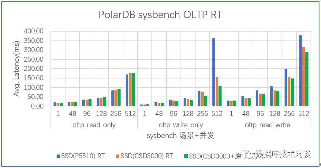 最后简单说明一下对比测试的信息。sysbench 50 表,总共 50 亿数据,两个 PolarDB-X 集群,DN 节点数据分别存储在 CSD3000 和 P5510 上。CSD3000 上的 PolarDB-X 集群先后重建两次,区别在于第二次重建的时候,将文件系统格式化重新挂载,启用 ext4 bigalloc特性,支持16KB IO,同时关闭DN节点的MySQL的原子写(参数 innodb_doublewrite)。CSD3000 默认开启了原子写功能,支持 4KB~128KB IO 的原子写。