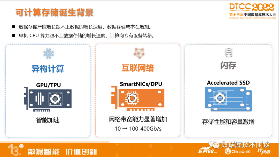 比如说 AI复杂的计算下推给 GPU/TPU等芯片,网络方面繁重的压缩和加密运算交给智能网卡等芯片,存储的计算可以卸载到SSD内部。这个就是可计算存储诞生的背景。