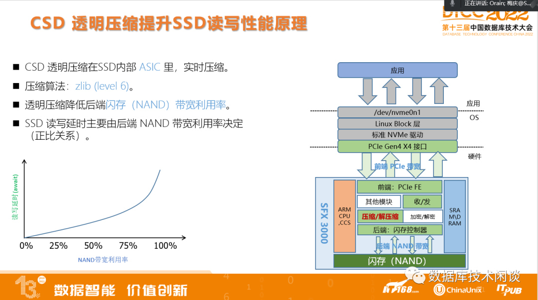 左下角图是SSD读写延时等待时间跟SSD闪存带宽使用率关系。可以看出,使用率越低,前端读写延时等待也越低。这个SSD读写延时是可以通过 iostat 命令观察到。这就是 CSD在性能方面比SSD标盘更好的关键原因。