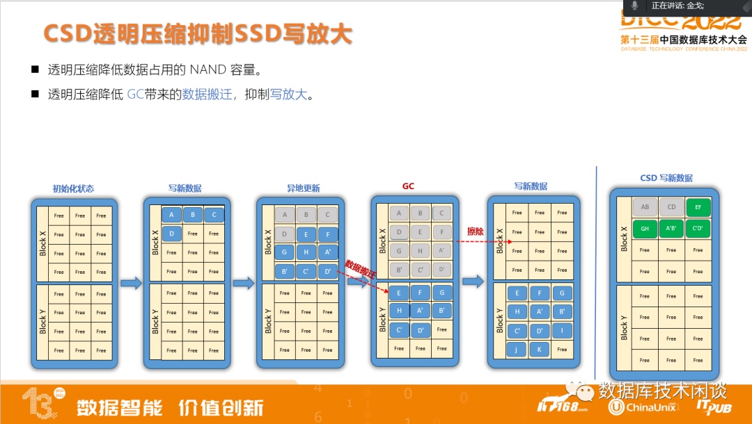最右边的图就是CSD的闪存写示意图,可以看到由于有了透明压缩,同样的数据占用的闪存页更少,所以剩余空间相对比较足,GC的必要性就不是很高,GC活动就相对很少,数据搬迁自然也少,写放大就很低。CSD的写放大是可以小于1的。
