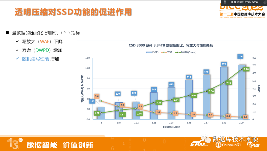 数据压缩特性变化会提升SSD寿命和性能,这是CSD相对于SSD标盘的一个独特之处。