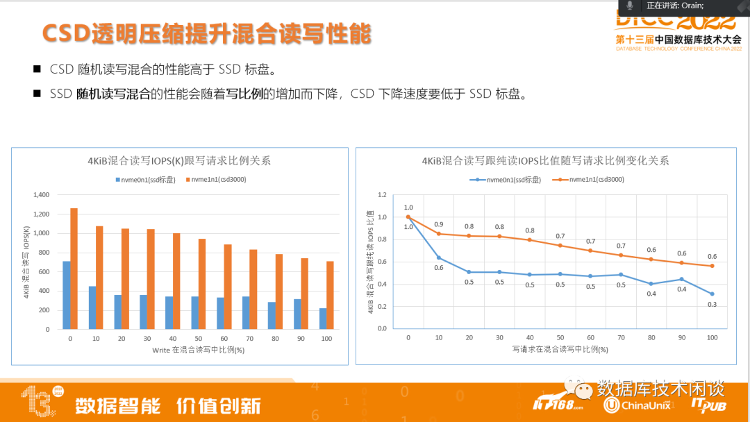不一样的地方是,CSD由于有透明压缩,其性能下降的幅度会比SSD标盘要低很多。下面左图是IOPS绝对值随着横坐标写比例增加而下降,右图是CSD和SSD的性能下降的比例趋势。橙色的是SFX3000,蓝色的SSD标盘。蓝色线更低。这个曲线走向证实了刚才的结论。