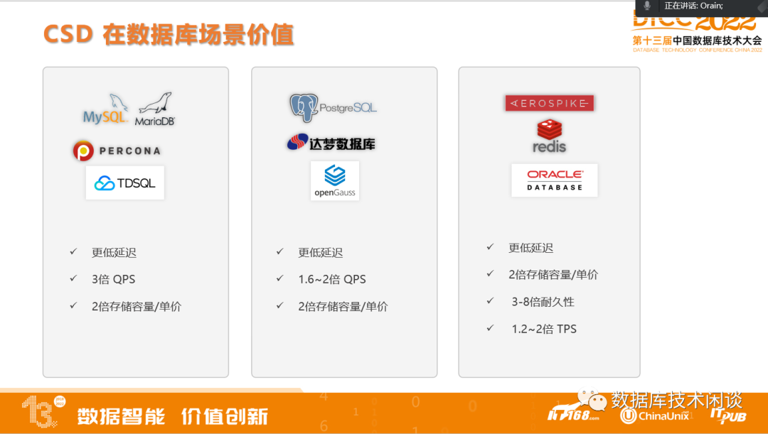 这些收益主要从4个角度去看:读写延时、读写QPS、存储容量成本、存储寿命等。不同数据库架构和存储引擎原理不同,取得的收益也不完全相同。其中以MySQL数据库的收益最多最大。比如说更低的延时,3倍QPS提升,以及存储成本降低到一半以下。其他数据库部署在CSD上,存储成本上都能降低一半,寿命也都有确定的提升,只是性能上面提升水平会有大有小。