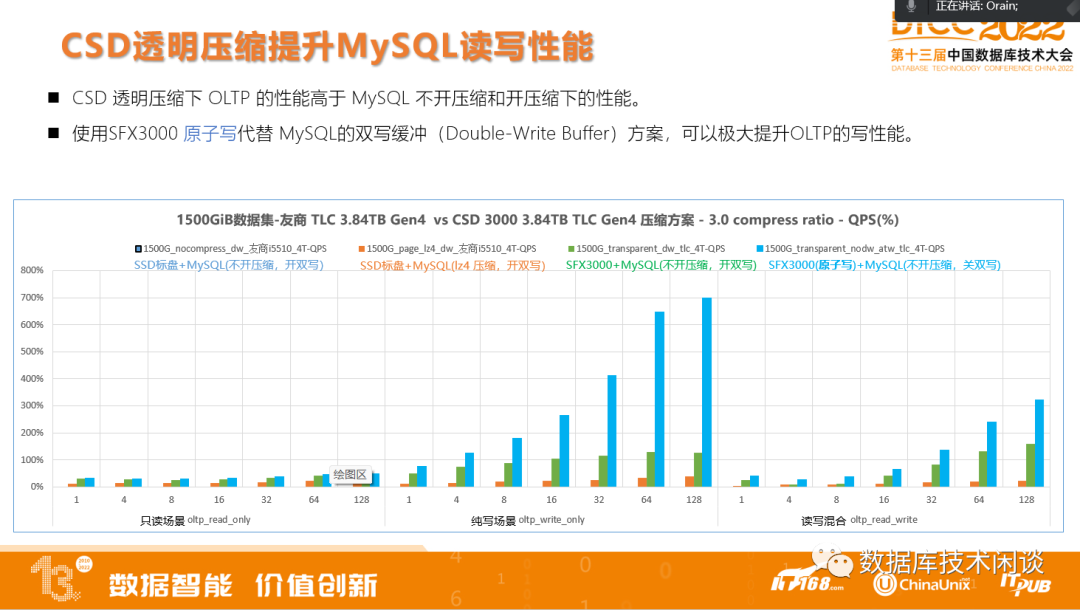 我们看一下sysbench OLTP场景测试数据。图中以MySQL在标盘上不开压缩的性能为基准,对比MySQL开压缩部署在SSD标盘上、MySQL不开压缩部署在SFX3000上的性能。在SFX3000上有两组数据,后者使用了CSD原子写方案。